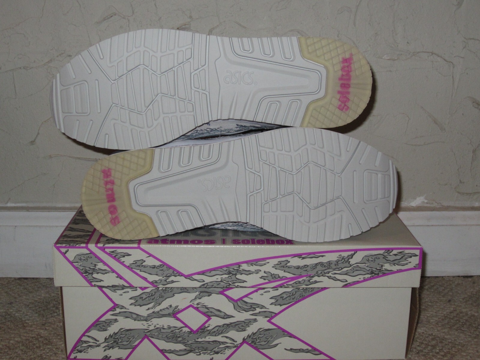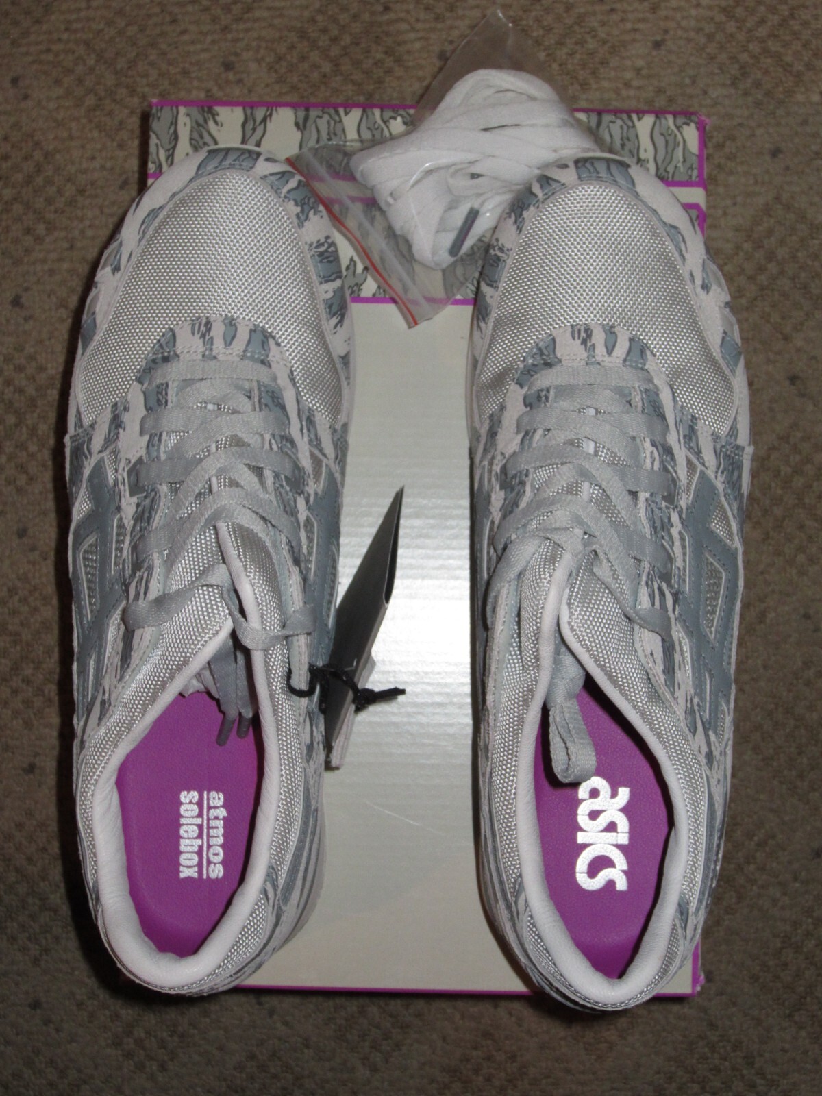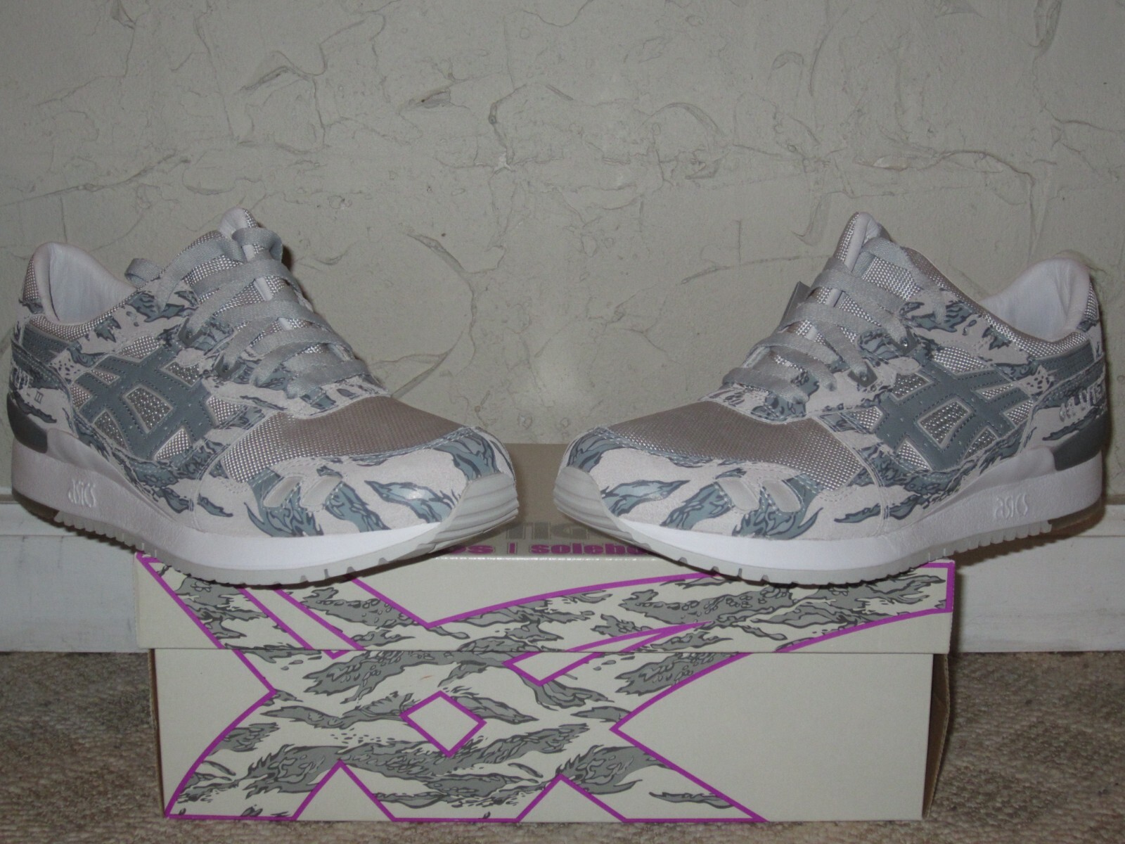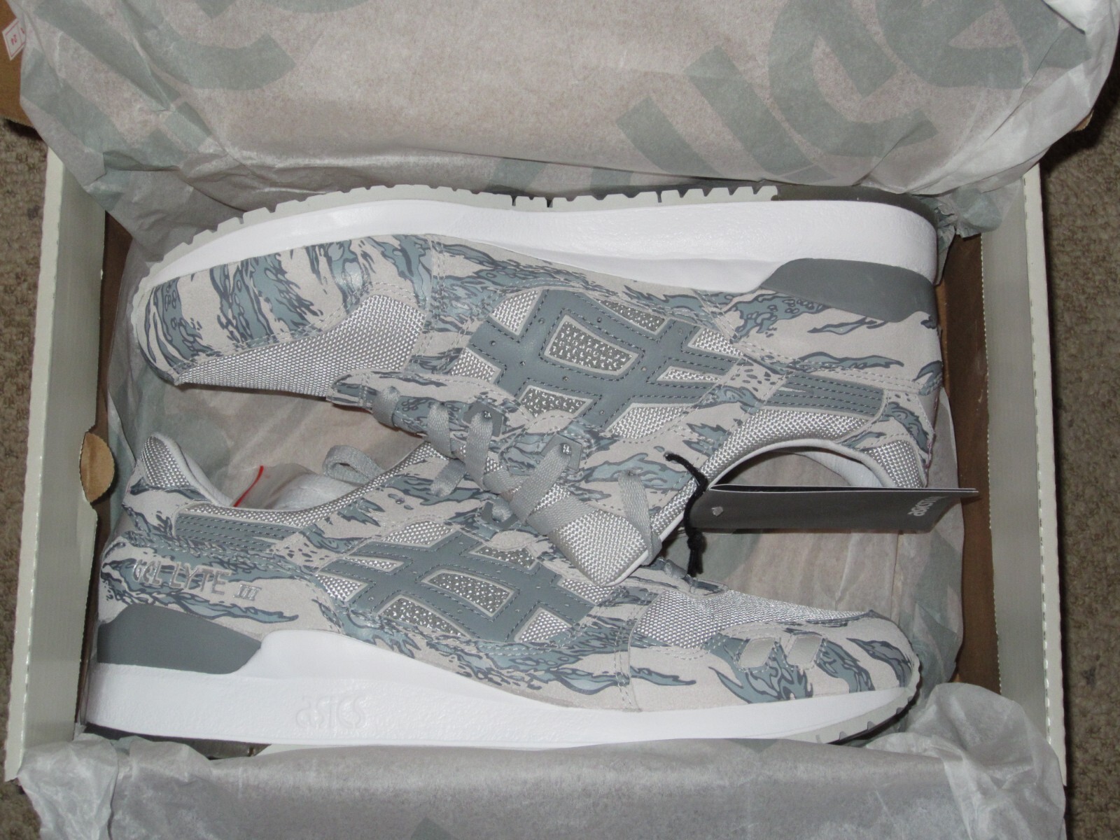 ASICS Gel Lyte III x Atmos x Solebox ‘Glacier Grey’ UK 7 – 1191A076-020. UK 7 / US 8 Glacier Grey/ Stone Grey, Camo – released in 2018 Limited Edition Condition: deadstock, Original box, paper, tags, extra laced Will be sent double boxed via Royal Mail Tracked Service